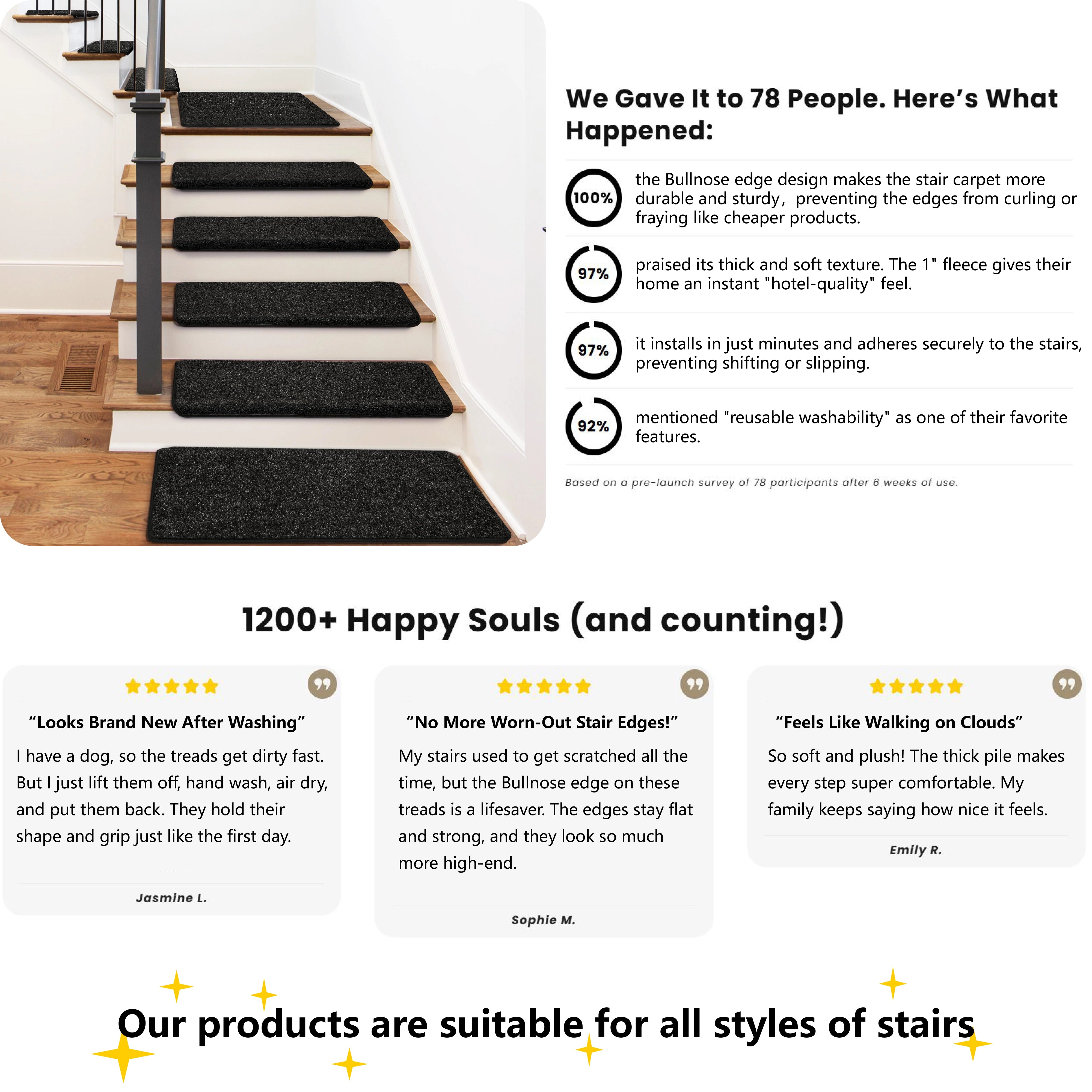 - Suitable for pets & kids: These step carpets create a safer, more secure walking surface, and allow your family and pets to easily go up and down our slippery and steep hardwood stairs, by reducing the likelihood of slips and falls.