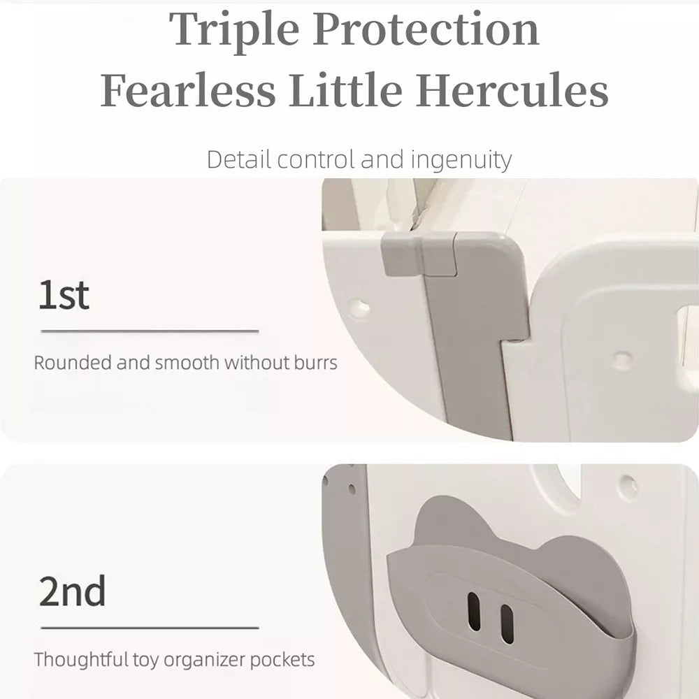 The fence has a reasonable height and a safety lock, preventing children from running out and allowing parents to watch their children's every move while freeing their hands.